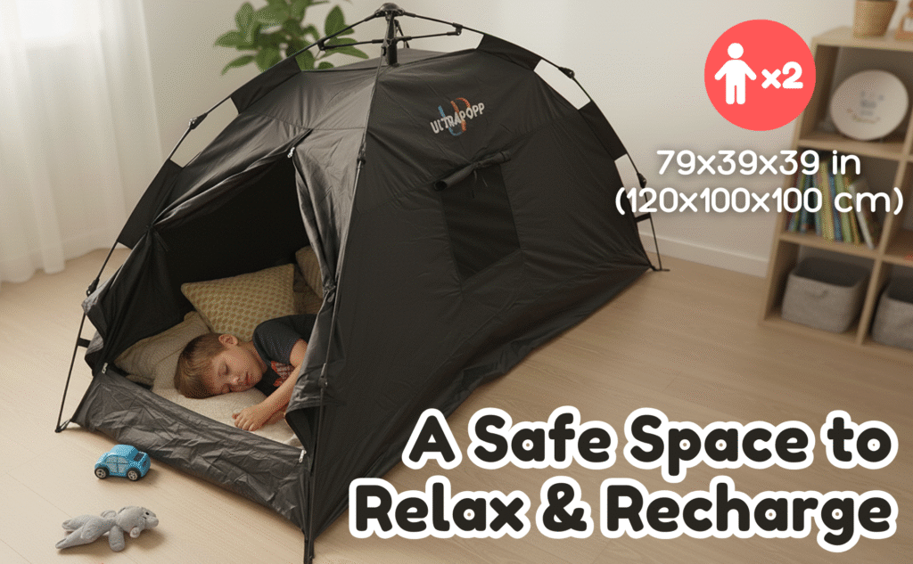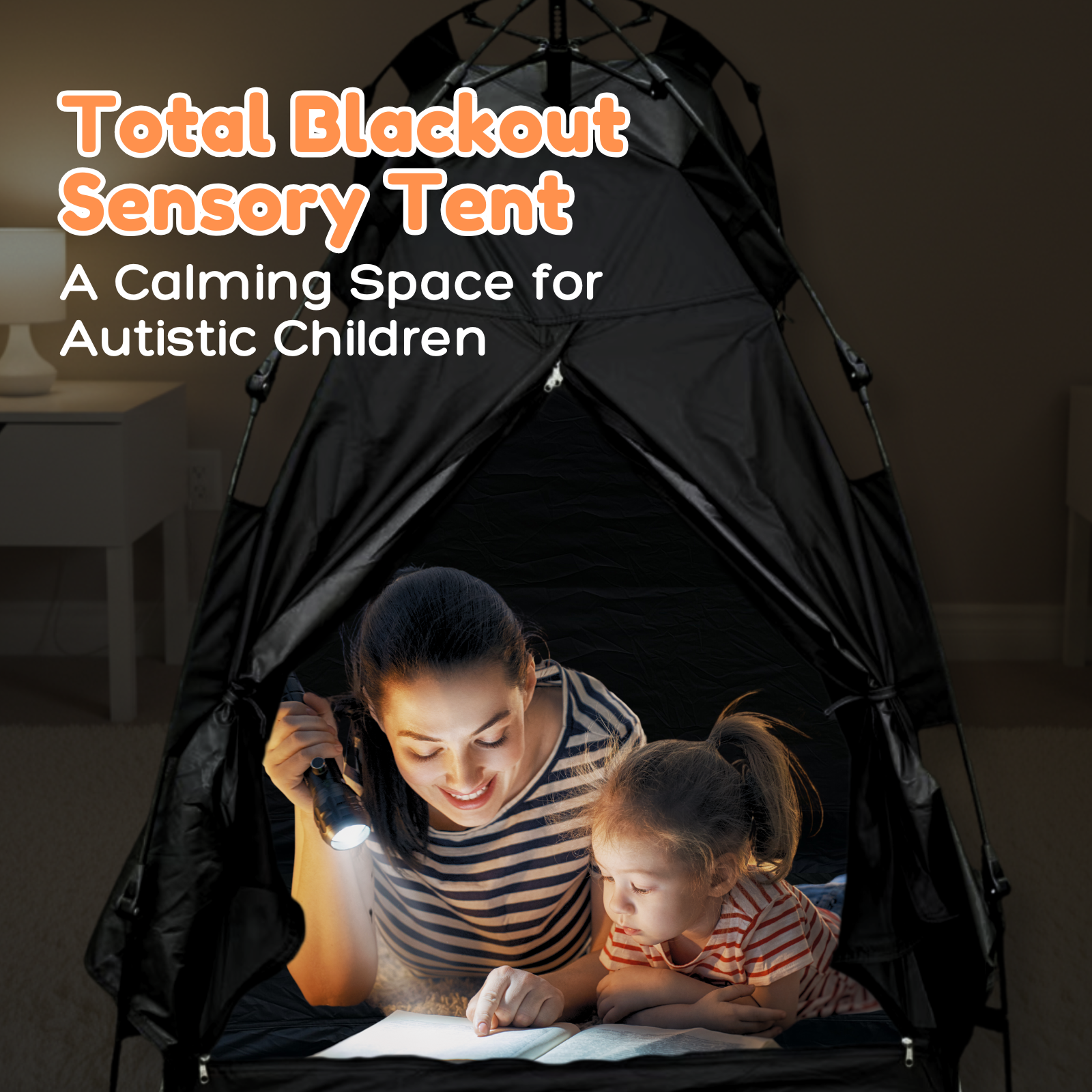 This blackout sensory tent for kids provides a calming space and serves as a hideout for kids to relieve anxiety and stress. It is great for children with autism, SPD, ADHD, ADD, SPD, OCD, or other special needs. It is quick to set up and pack away, with no skills required. It also has a bag for convenient storage and transport.